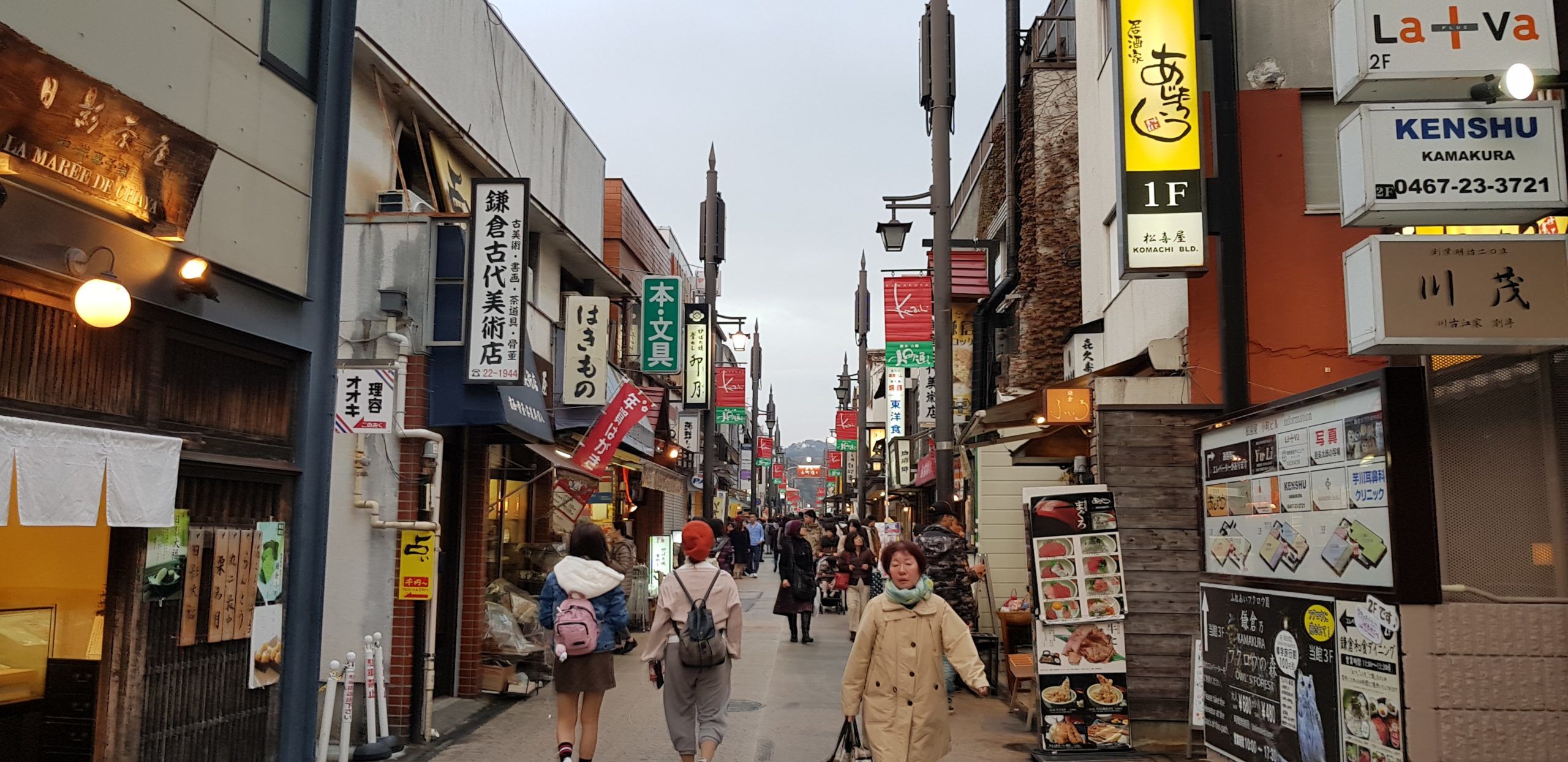 Vom JR-Bahnhof Kamakura aus findest du den Eingang durch ein rotes Torii-Tor gekennzeichnet. Entlang dieser beliebten Straße findest du eine große Auswahl an Modeboutiquen, japanischen Souvenirläden und zahllosen Cafés, Restaurants und Bäckereien, aus denen du wählen kannst.