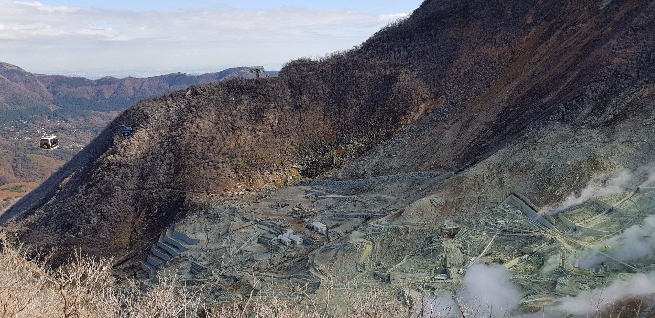 Von Gora nach Sounzan kannst du mit einem Kleinbus den Berg hinauffahren, um die Seilbahn zu erreichen. Von Sounzan nach Owakudani kannst du die Tozan-Seilbahn nehmen, um diesen Punkt zu erreichen. Wenn du endlich in Owakudani angekommen bist, solltest du unbedingt etwas Zeit hier verbringen, denn es gibt eine Reihe von Aussichtsplattformen, von denen du einen guten Blick auf das umliegende Tal und die geothermischen Aktivitäten in der Gegend werfen kannst.