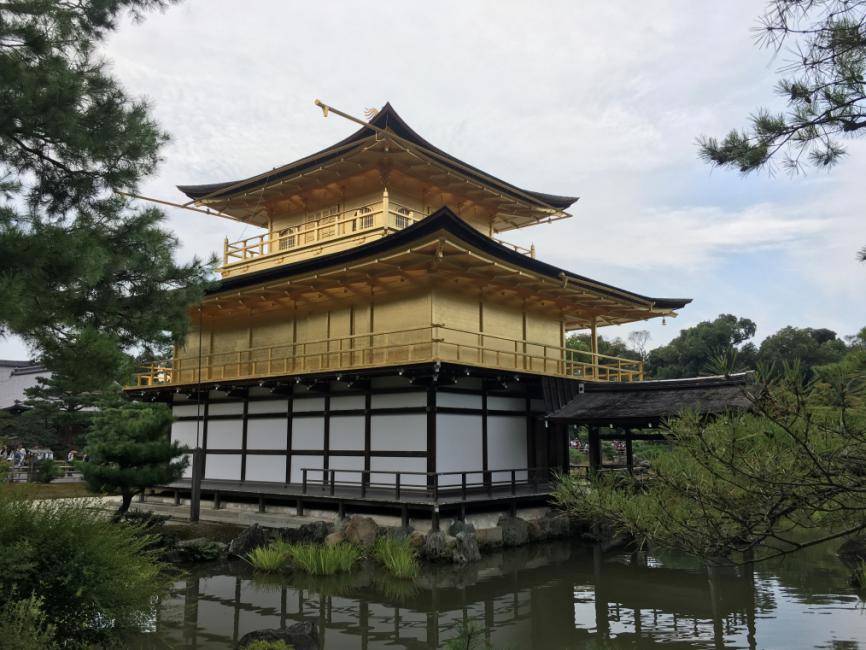 Der Tempel ist ein Zen-Tempel, dessen obere zwei Stockwerke vollständig mit Blattgold bedeckt sind.