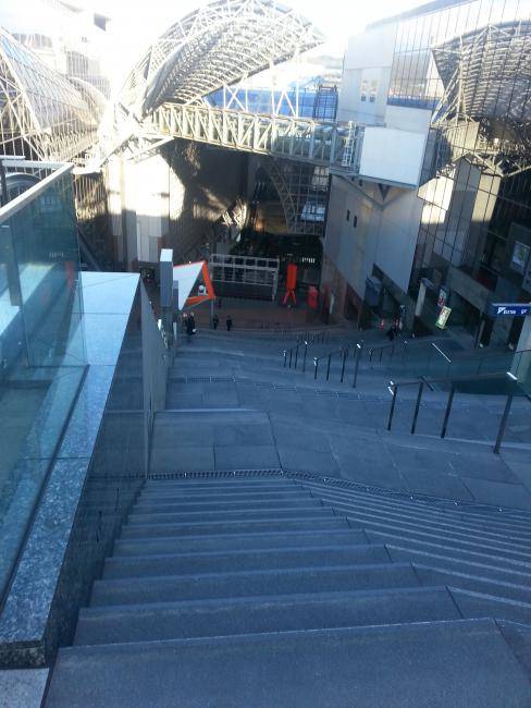 Man sollte sich einen Moment Zeit nehmen, um vom Nordeingang (mit Blick auf den Bahnhof) nach oben zu schauen. Das Atrium ist riesig und du kannst dir eine Vorstellung davon machen, wenn du die Rolltreppen auf der rechten Seite nimmst. Drei Stockwerke höher befindet sich eine (eigentlich überdachte) Freilichtbühne mit einem Amphitheater aus Stufen, das Platz für mehrere tausend Menschen bietet. Darunter befindet sich das Kaufhaus Isetan, so dass der Platz gut ausgenutzt ist.