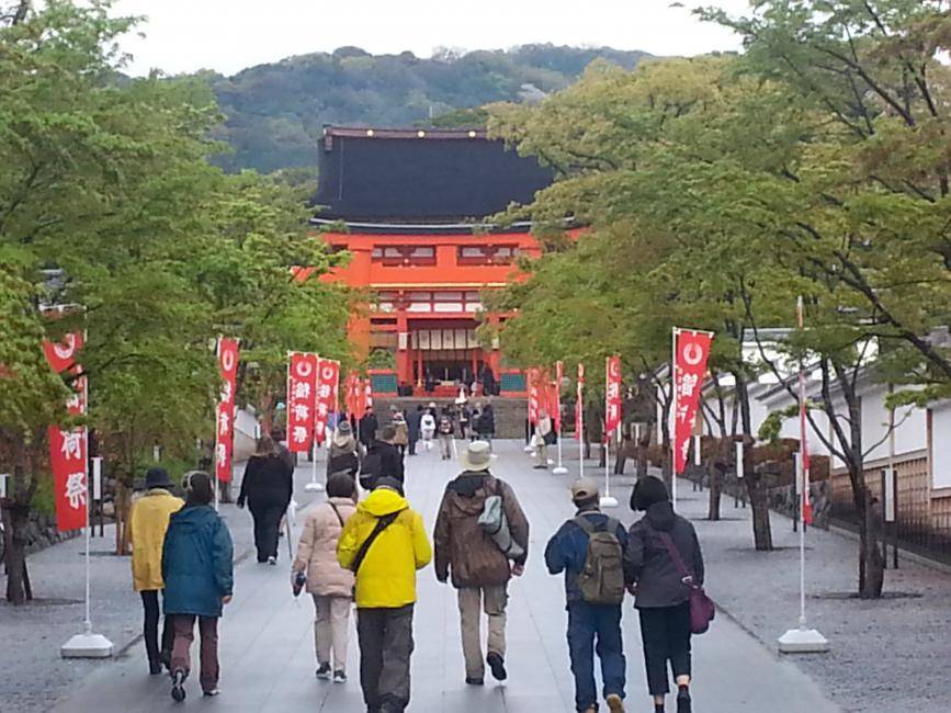 Auf dem Weg zum Heian-Schrein bekamen wir einen Eindruck von der Größe des Geländes, das von Mauern umgeben ist. Obwohl der Schrein selbst nur einen kleinen Teil des Geländes einnimmt, ist er doch sehr groß. Trotzdem kann es bei besonderen Anlässen auf den weitläufigen Freiflächen sehr voll werden.